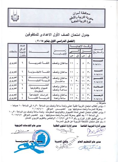 اعتمد اليوم الخميس، محمد عبده حواتى و كيل وزارة التعليم باسوان جدول امتحانات الفصل الدراسى الاول للمرحلة الاعدادية للمكفوفين ومن المقرر أن تبدأ يوم 10 يناير المقبل .