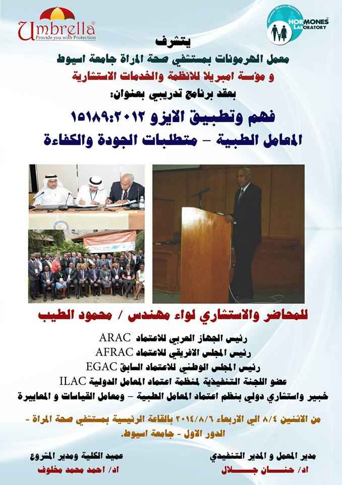 يعقد معمل الهرمونات بمستشفى صحة المرأة جامعة أسيوط بالتعاون مع مؤسسة امبريلا للأنظمة و الخدمات الإستشارية برنامج تدريبى بعنوان ” فهم و تطبيق الأيزو 2010 : 15189 , المعمل الطبية – متطلبات الجودة و الكفاءة , و ذلك على مدى يومين من غداً الإثنين حتى الأربعاء بالقاعة الرئيسية بالدور الأول …