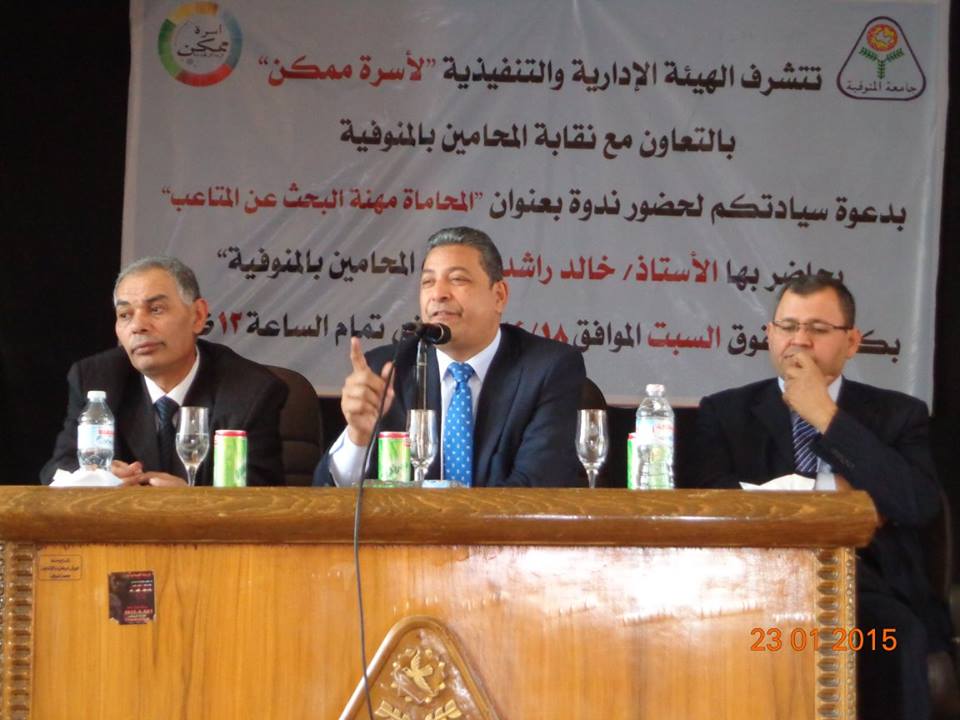 نظمت كلية الحقوق بجامعة المنوفية، اليوم الثلاثاء، ندوة تثقيفية حول مهنة المحاماة تحت عنوان “المحاماة مهنة البحث عن المتاعب” برعاية الدكتور معوض محمد الخولى، رئيس الجامعة، والدكتور عباس الغزيرى، عميد كلية الحقوق، وبحضور خالد راشد، نقيب محامى المنوفية وعضو النقابة العامة، وعدد من الطلاب والأساتذة وأعضاء هيئة التدريس بالكلية. وأكد …