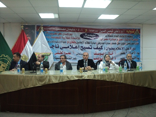 نظم الإتحاد العام للطلاب بجامعة بنها بالإشتراك مع مشروع الأنشطة الطلابية تحت رعاية الأستاذ الدكتور علي شمس الدين رئيس الجامعة والأستاذ الدكتور سليمان مصطفى نائب رئيس الجامعة لشئون التعليم والطلاب وبالإشتراك مع قسم الإعلام بكلية الآداب تحت عنوان ” كيف تصبح اعلامى ناحج” حضر الندوة المخرج خالد يوسف والدكتورة …