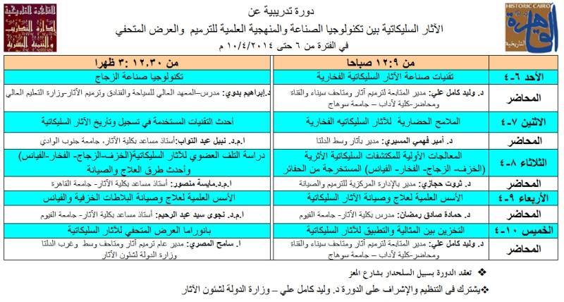 تنظم إدارة التدريب والتنمية البشرية بالقاهرة التاريخية فى شهر إبريل القادم دورة تدريبية بعنوان “الآثار السليكاتية بين تكنولوجيا الصناعة والمنهجية العلمية للترميم والعرض المتحفي” وذلك فى الفترة من 6 الى 10 ابريل. الدورة من اعداد د.وليد كامل على: مدير المتابعة لترميم آثار ومتاحف سيناء والقناة, وتتناول الدورة تقنيات صناعة الآثار …