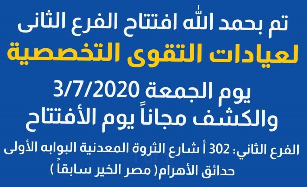 افتتح الدكتور سامح عبد الفتاح والدكتور سمير كرم الفرع الثاني من «عيادات التقوى التخصصية الحديثة» وذلك بشارع الثروة المعدنية بحدائق الاهرام وسط الاجراءات الاحترازية للوقاية من مرض كوفيد-19. وقد صرح دكتور سامح عبد الفتاح مدير معامل سمارت لاب للتحاليل انه تم الاتفاق مع دكتور نصار جمال ودكتور عبد الرحمن صلاح …