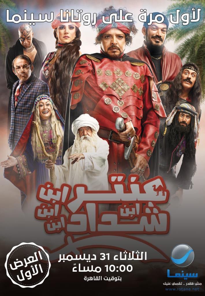 مشاهدو روتانا سينما على موعد في تمام العاشرة مساء ليلة رأس السنة غدا الثلاثاء (٣١ ديسمبر ٢٠١٩) مع هدية خاصة من هدايا روتانا لمشاهديها بمناسبة مرور 15 سنة على انطلاقها وهى العرض الاول فضائيا لفيلم (عنتر ابن ابن ابن ابن شداد) أحد أهم الافلام الكوميدية التي قدمها النجم محمد هنيدي …
