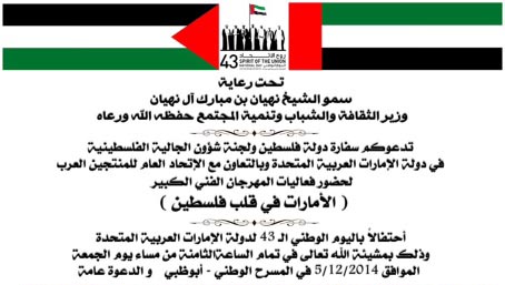 يطلق الاتحاد العام للمنتجين العرب اوبريت “القدس زهرة المدائن” في تمام الثامنة من مساء اليوم الجمعة على المسرح الوطني في عاصمة دولة الإمارات العربية المتحدة “ابو ظبي” برعاية وحضور سمو الشيخ / نهيان بن مبارك ال نهيان “وزير الثقافة والشباب وتنمية المجتمع” بمناسبة الاحتفالات بالعيد الوطني الـ 43 لدولة الامارات …