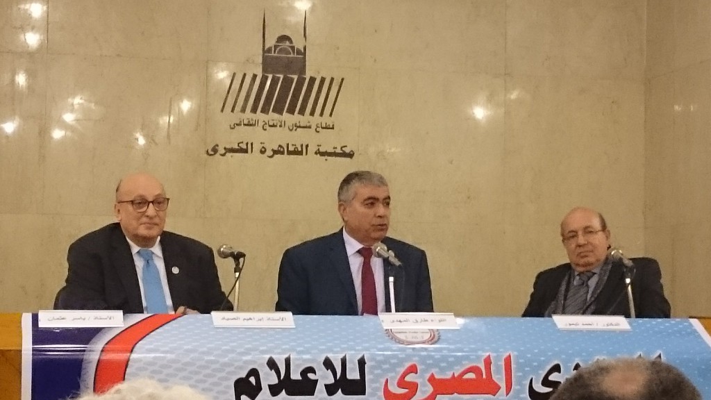 اقام المنتدى المصري للاعلام برئاسة اللواء طارق مهدي, اولى فعالياته بعدما تم اشهاره رسميا وهي ندوة بعنوان “اعلام مواجهة الارهاب” بمكتبة القاهرة الكبرى بالزمالك في حضور رئيس وزراء مصر الاسبق الدكتور عصام شرف, واللواء بحري يسري قنديل, والخبير العسكري اللواء طلعت مسلم, والآستاذ ياسر عثمان, رئيس مجلس ادارة مكتبة القاهرة …