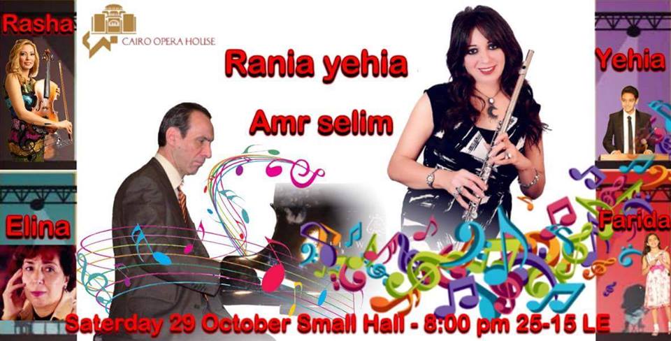 يشهد المسرح الصغير بدار الآوبرا المصرية الليلة, أمسية فنية تحيها عازفة “الفلوت” الدكتورة رانيا يحي, وعازف البيانو الفنان عمرو سليم, حيث يقدمان مجموعة رائعة من المعزوفات الموسيقية. يشارك في الحفل الدكتورة رشا يحي, والفنان الصغير يحيى الهرميل والفنانة الصغيرة فريدة الهرميل، وعازفة البيانو الجورجية الينا دزامافيلى.