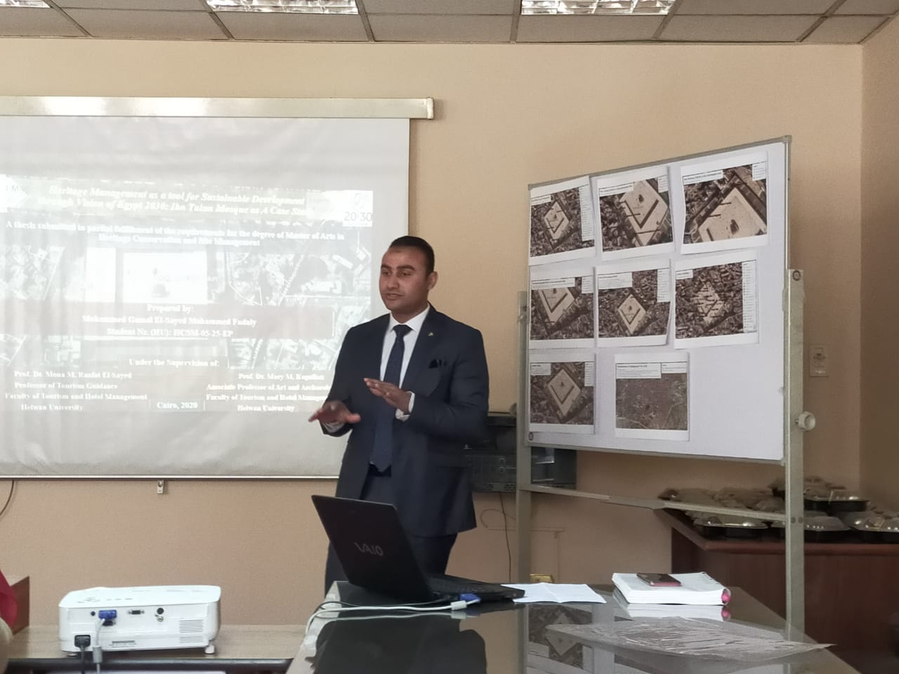 ناقش الباحث محمد فضالي رسالة الماجستير الخاصة به تحت عنوان “ادارة التراث كأداة لتحقيق التنمية المستدامة من خلال رؤية مصر 2030 جامع احمد ابن طولون” -كحالة دراسية- وذلك بكلية سياحة وفنادق التابعة لجامعة حلوان بمنطقة القصر العيني في بداية العرض رحب فضالي بالأساتذة المشرفات على الرسالة وهما: دكتورة منى رأفت …