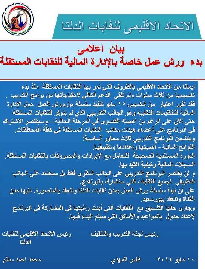 بدء ورش عمل خاصة بالإدارة المالية للنقابات المستقلةإيمانا من الاتحاد الاقليمى بالظروف التي تمر بها النقابات المستقلة منذ بدء تأسيسها من ثلاث سنوات ولم تلقى الدعم الكافي لاحتياجاتها من برامج التدريب , فقد تقرر اعتبار من الخميس 15 مايو تنفيذ سلسلة من ورش العمل حول الإدارة المالية للتنظيمات النقابية وهو …